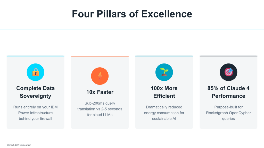The SLM runs entirely on your IBM Power hardware, behind your firewall, under your security policies. Your queries never leave your infrastructure. Your schema remains confidential. Your business logic stays proprietary. Compliance teams can finally sleep soundly.
